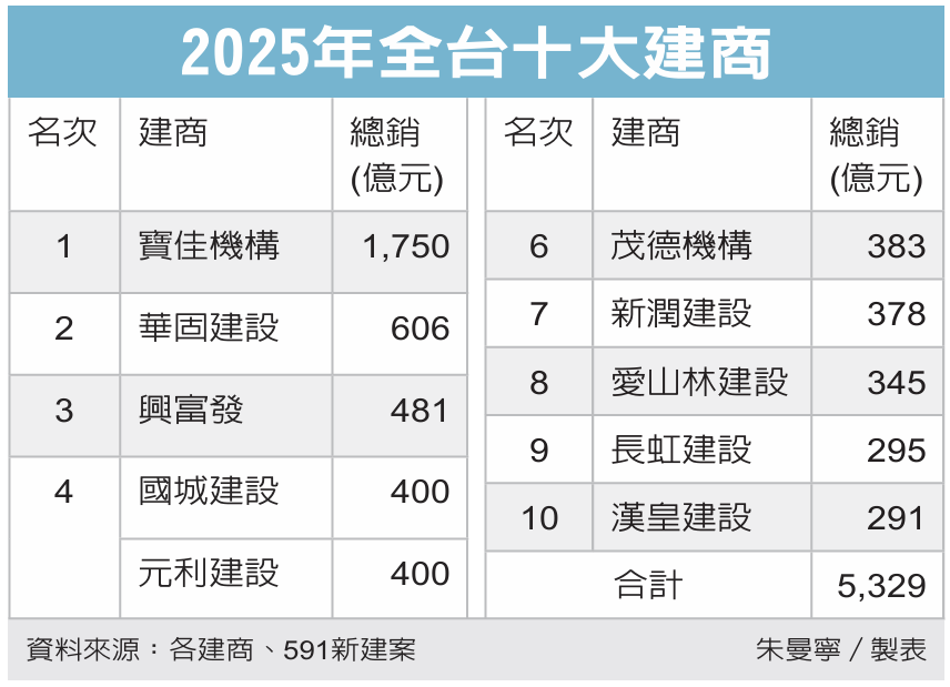 房市冷颼颼,建商推案也放緩步調。根據591新建案統計,2025年全台十大建商依序為寶佳、華固(2548)、興富發、國城、元利、茂德、新潤、愛山林、長虹、漢皇,總銷金額合計約5,329億元,不僅較前年減29%,也是史上最慘,另外推案個數則從154件銳減至88件,年減逾四成。
