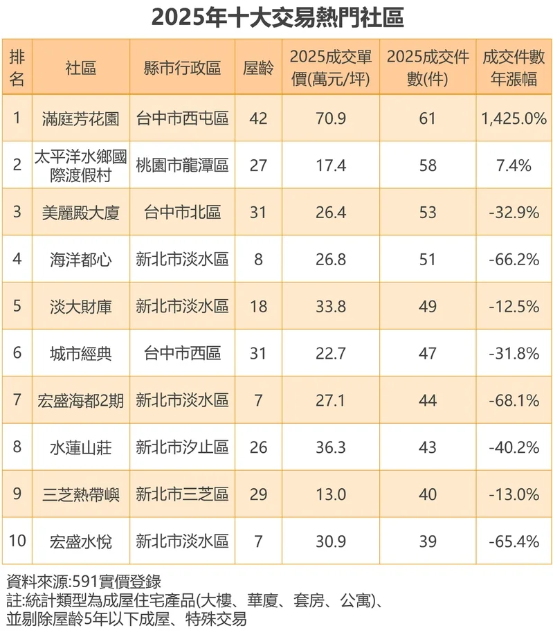 據《591實價登錄》統計,2025年全國十大交易熱門社區中,台中西屯、屋齡42年的「滿庭芳花園」奪下冠軍,全年累計61件成交;其次是桃園龍潭「太平洋水鄉國際渡假村」與台中北區「美麗殿大廈」,三大社區平均「周周成交」,表現亮眼。591實價登錄/提供