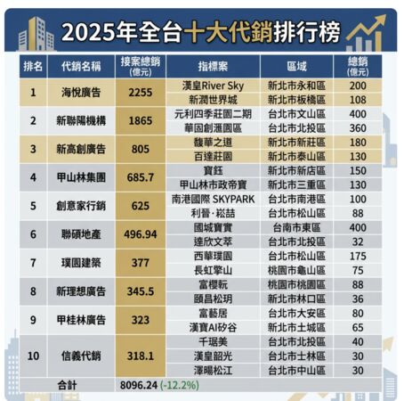 2025年全台10大代銷出爐,海悅接案總銷2255億元,連續7年奪下龍頭寶座。而本屆最大黑馬是聯碩,憑藉台南東區「國城寳實」大案,年度接案總銷衝到近500億元,年增近3倍,首次入榜。